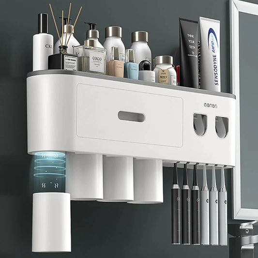 "Organize Your Bathroom with the Magnetic Adsorption Toothbrush Holder and Waterproof Storage Box - Includes Toothpaste Dispenser and Wall Mount - Perfect Bathroom Accessories for Easy and Stylish Storage!"