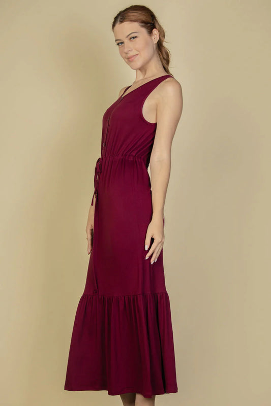 "Capella Maxi Dress: Sleeveless Chic with Button Front and Waist Tie"